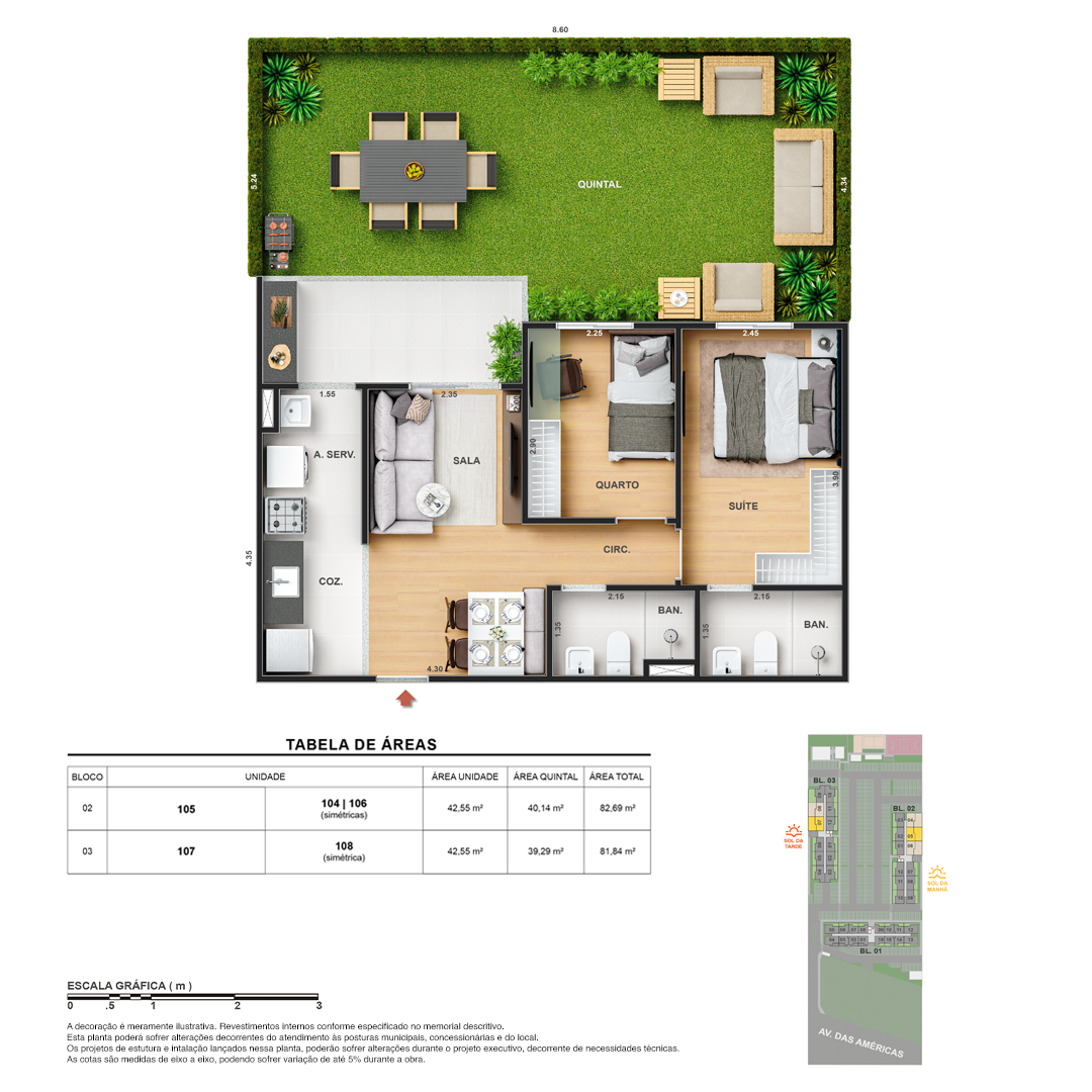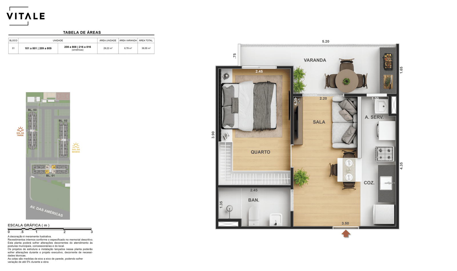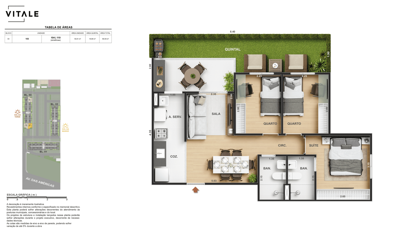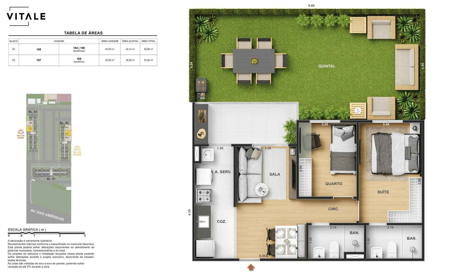 Todas as perspectivas, ilustrações e plantas contidas neste material foram concebidas como uma idealização artística de seus executores, de forma que ilustrem como pretendem que venha a ser o empreendimento em seu todo. O imóvel será construído com fiel observância das plantas aprovadas, das especificações e do memorial descritivo que integram o memorial de incorporação, podendo a PROMITENTE VENDEDORA, no entanto, por conveniência técnica, determinação do Poder Público ou exigência das empresas concessionárias de serviços públicos e Caixa Econômica Federal, promover modificações no projeto aprovado, sem que assista a qualquer das partes direito à indenização ou compensação de qualquer natureza. O paisagismo especificado nas ilustrações artísticas dos materiais publicitários é meramente enunciativo, de modo que o mesmo será executado com “mudas”, cabendo ao condomínio a responsabilidade de manter e zelar para que o referido paisagismo atinja ou se aproxime do nível sugerido no material exibido. As imagens, mobiliários, equipamentos e acabamentos são de caráter ilustrativo e não integram o contrato de compra e venda. As áreas poderão sofrer ajustes em razão de exigências técnicas ou legais, dentro das tolerâncias previstas pelas normas da ABNT. Projeto de construção aprovado pela Prefeitura Municipal da cidade do Rio de Janeiro, através do processo nº EISPRO2024/21600. Arquiteta responsável pelo Projeto: VIRGINIA LANNES EMANUEL CAU/RJ A4301-0. Engenheiro responsável pela Obra: CARLOS EDUARDO FÉLIX PAIVA CREA/RJ 2003103537. Propriedade de VITALE V20 EMPREENDIMENTOS