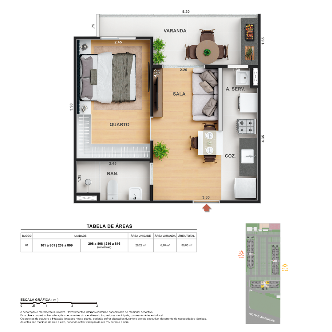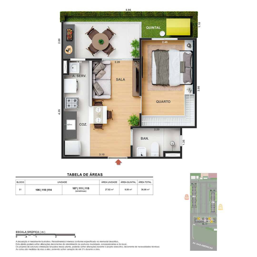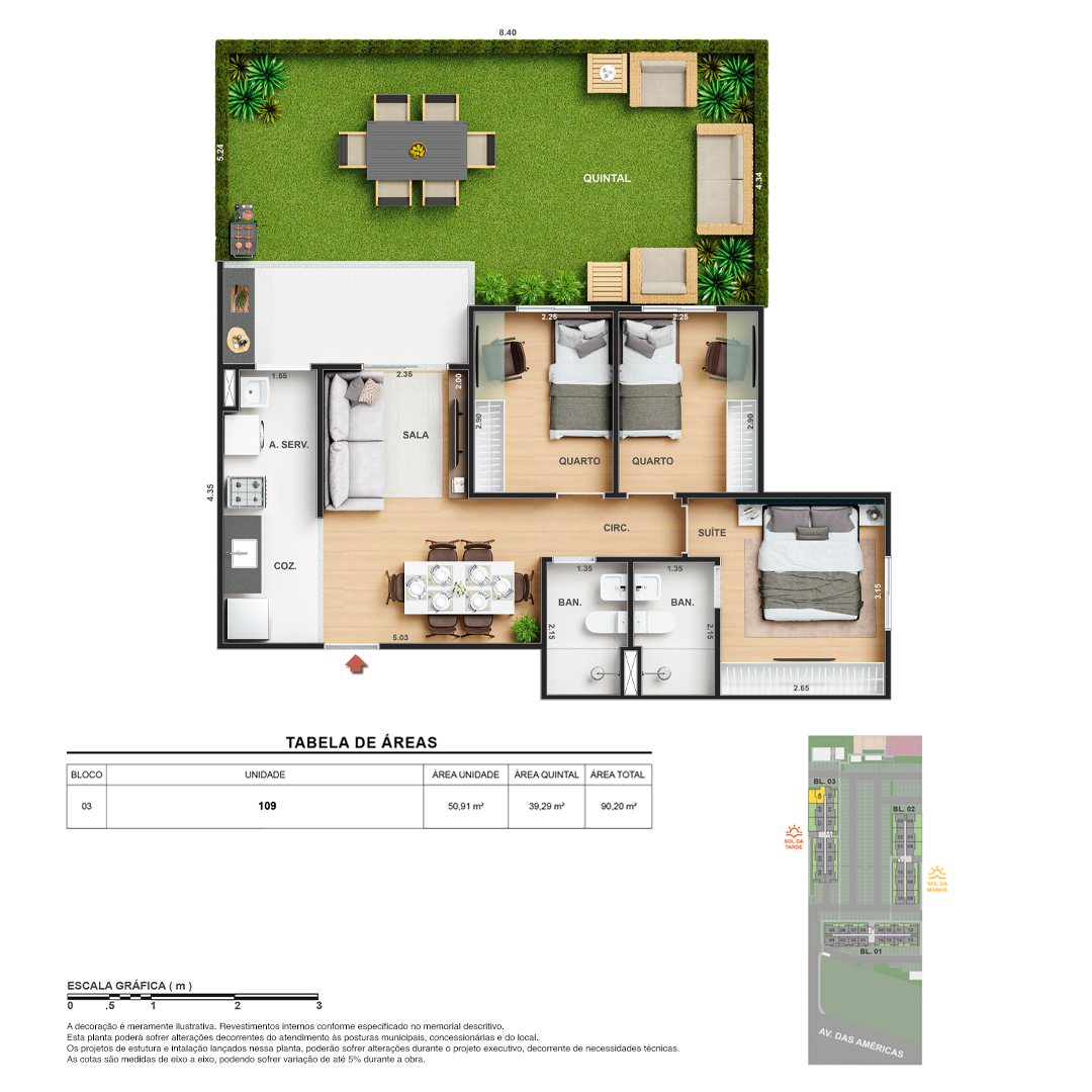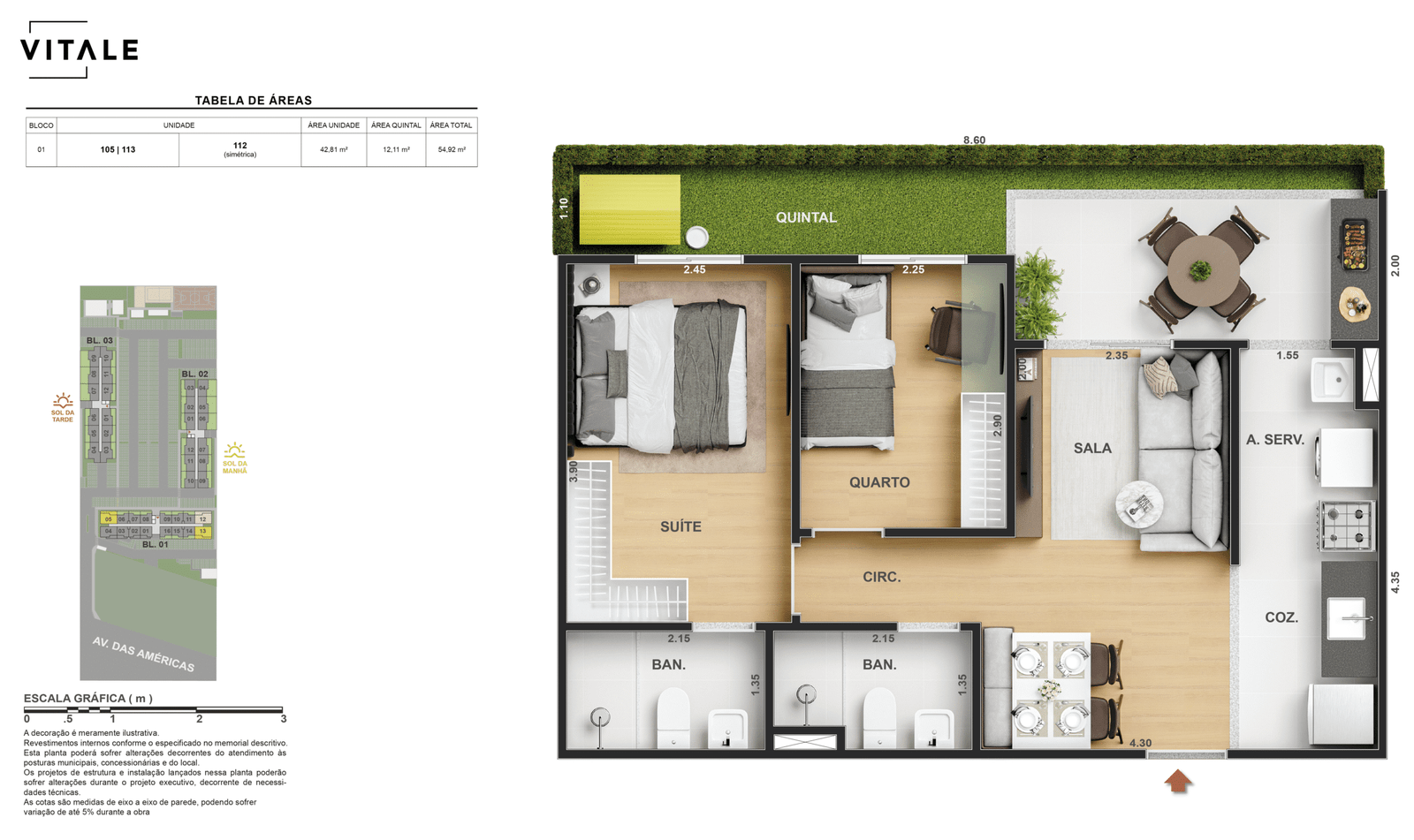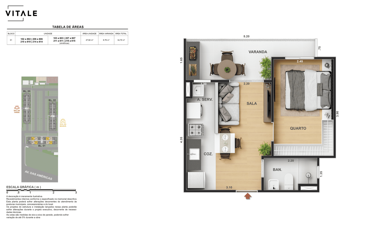 Todas as perspectivas, ilustrações e plantas contidas neste material foram concebidas como uma idealização artística de seus executores, de forma que ilustrem como pretendem que venha a ser o empreendimento em seu todo. O imóvel será construído com fiel observância das plantas aprovadas, das especificações e do memorial descritivo que integram o memorial de incorporação, podendo a PROMITENTE VENDEDORA, no entanto, por conveniência técnica, determinação do Poder Público ou exigência das empresas concessionárias de serviços públicos e Caixa Econômica Federal, promover modificações no projeto aprovado, sem que assista a qualquer das partes direito à indenização ou compensação de qualquer natureza. O paisagismo especificado nas ilustrações artísticas dos materiais publicitários é meramente enunciativo, de modo que o mesmo será executado com “mudas”, cabendo ao condomínio a responsabilidade de manter e zelar para que o referido paisagismo atinja ou se aproxime do nível sugerido no material exibido. As imagens, mobiliários, equipamentos e acabamentos são de caráter ilustrativo e não integram o contrato de compra e venda. As áreas poderão sofrer ajustes em razão de exigências técnicas ou legais, dentro das tolerâncias previstas pelas normas da ABNT. Projeto de construção aprovado pela Prefeitura Municipal da cidade do Rio de Janeiro, através do processo nº EISPRO2024/21600. Arquiteta responsável pelo Projeto: VIRGINIA LANNES EMANUEL CAU/RJ A4301-0. Engenheiro responsável pela Obra: CARLOS EDUARDO FÉLIX PAIVA CREA/RJ 2003103537. Propriedade de VITALE V20 EMPREENDIMENTOS