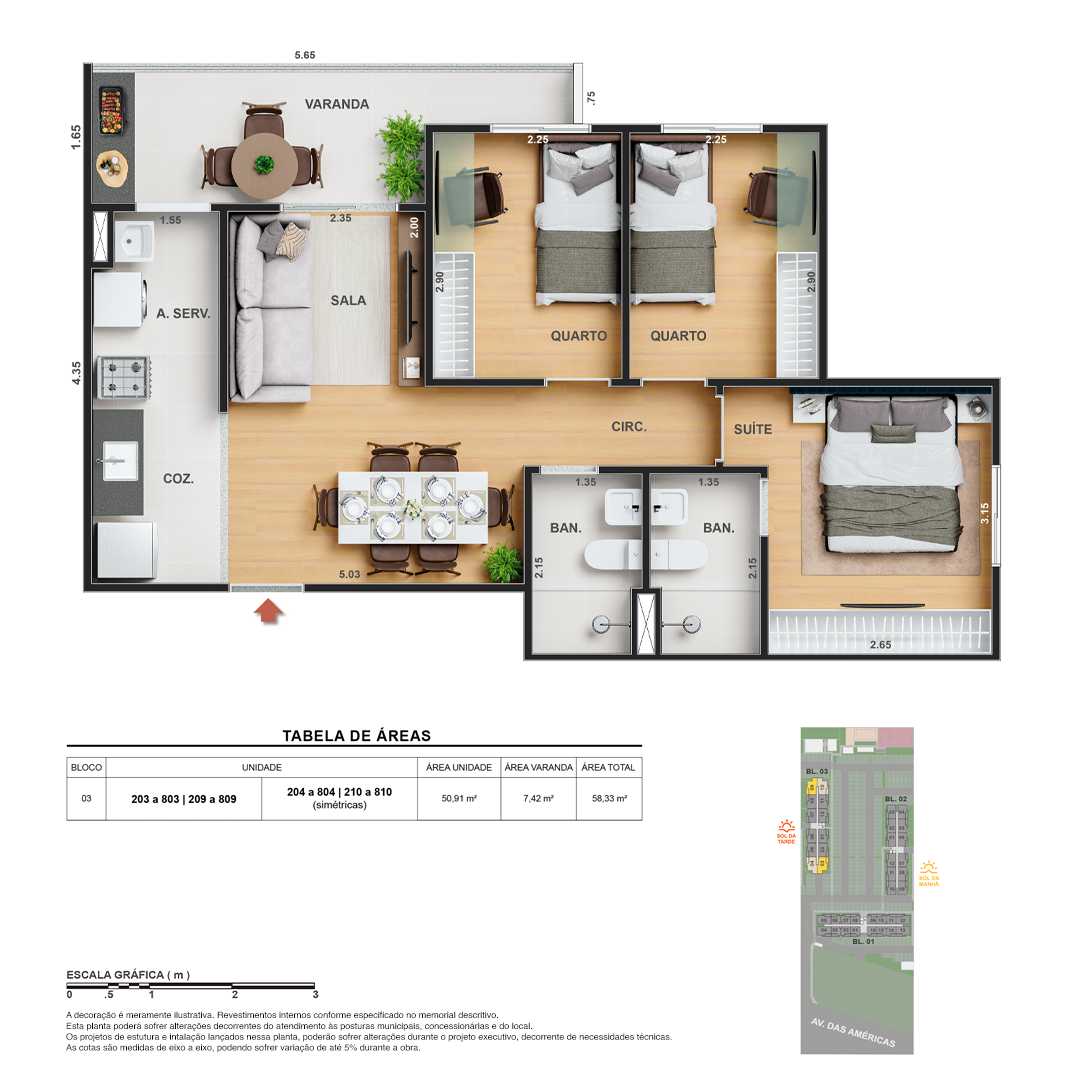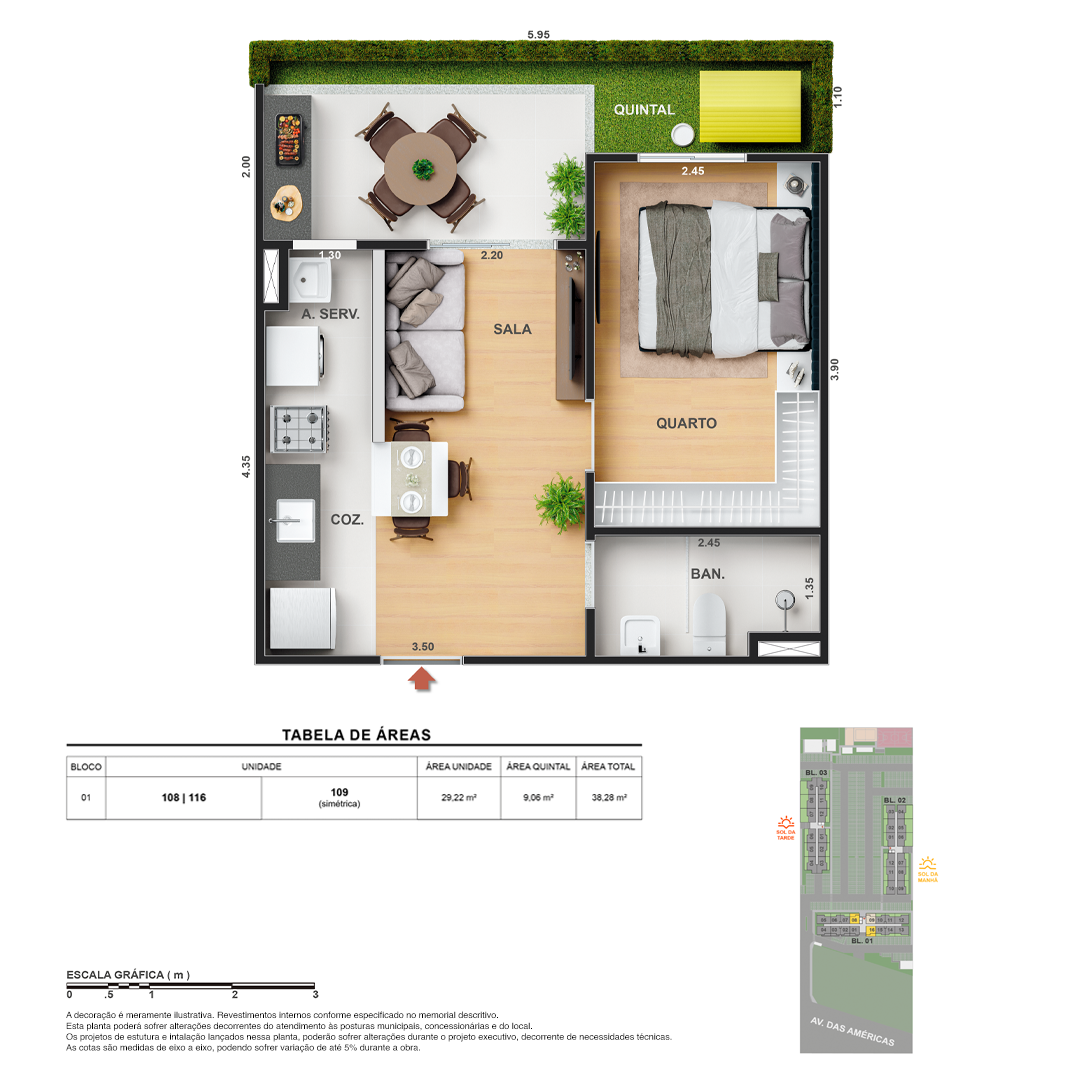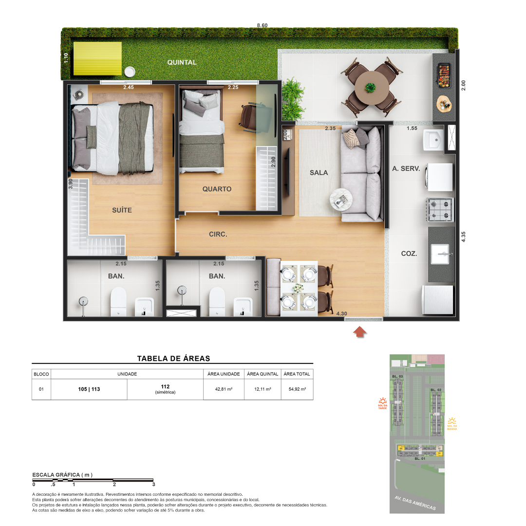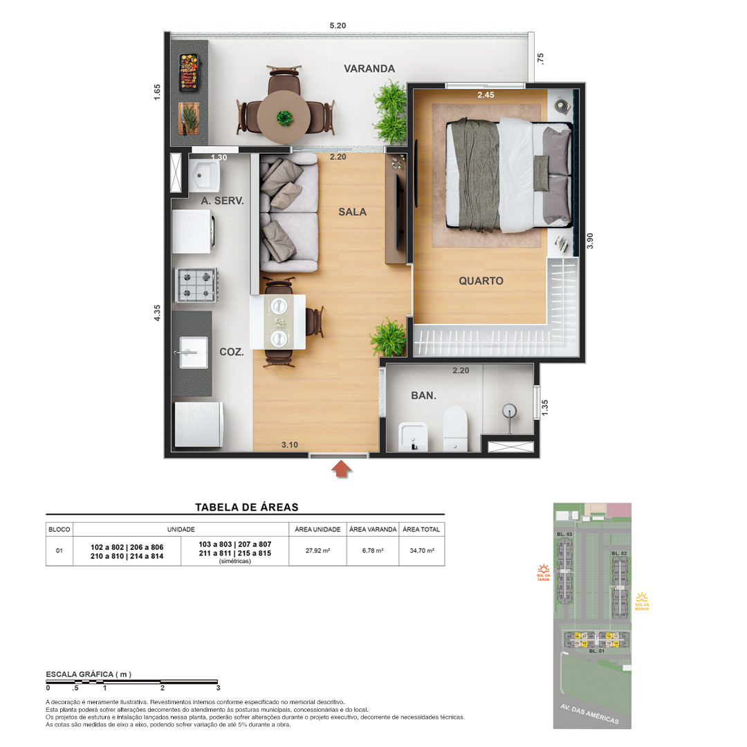 Todas as perspectivas, ilustrações e plantas contidas neste material foram concebidas como uma idealização artística de seus executores, de forma que ilustrem como pretendem que venha a ser o empreendimento em seu todo. O imóvel será construído com fiel observância das plantas aprovadas, das especificações e do memorial descritivo que integram o memorial de incorporação, podendo a PROMITENTE VENDEDORA, no entanto, por conveniência técnica, determinação do Poder Público ou exigência das empresas concessionárias de serviços públicos e Caixa Econômica Federal, promover modificações no projeto aprovado, sem que assista a qualquer das partes direito à indenização ou compensação de qualquer natureza. O paisagismo especificado nas ilustrações artísticas dos materiais publicitários é meramente enunciativo, de modo que o mesmo será executado com “mudas”, cabendo ao condomínio a responsabilidade de manter e zelar para que o referido paisagismo atinja ou se aproxime do nível sugerido no material exibido. As imagens, mobiliários, equipamentos e acabamentos são de caráter ilustrativo e não integram o contrato de compra e venda. As áreas poderão sofrer ajustes em razão de exigências técnicas ou legais, dentro das tolerâncias previstas pelas normas da ABNT. Projeto de construção aprovado pela Prefeitura Municipal da cidade do Rio de Janeiro, através do processo nº EISPRO2024/21600. Arquiteta responsável pelo Projeto: VIRGINIA LANNES EMANUEL CAU/RJ A4301-0. Engenheiro responsável pela Obra: CARLOS EDUARDO FÉLIX PAIVA CREA/RJ 2003103537. Propriedade de VITALE V20 EMPREENDIMENTOS